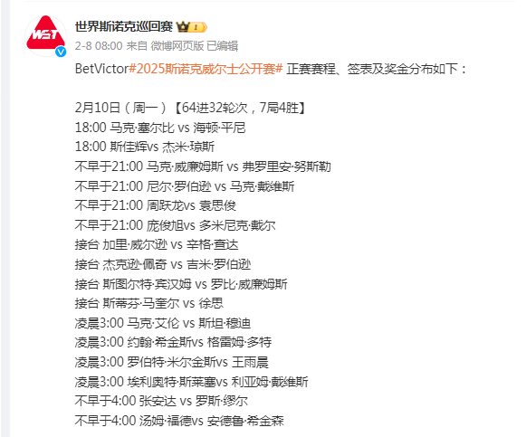 2025年开年之后,斯诺克赛事相等平庸,巨匠赛(“魔术师”肖恩-墨菲)、德国巨匠赛(“囧哥”凯伦-威尔逊)、邀请赛版冠军联赛(“磨王”马克-塞尔比)先后决出冠军,而将与今天开赛的威尔士公开赛,是第四项决出冠军的赛事。